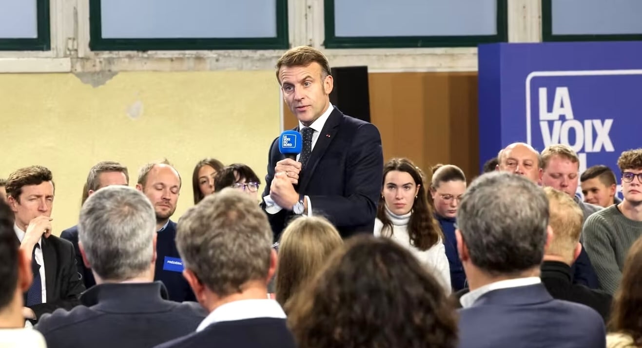 Emmanuel Macron avec des lecteurs de La Voix du Nord. © François Lo Presti/AFP.