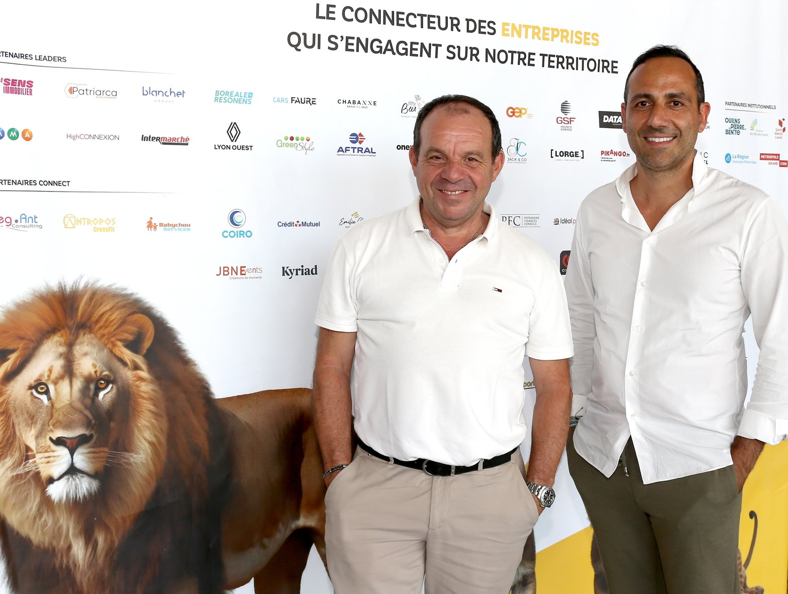 Un trio bien bronzé : Guillaume Guttin (à d.) avec Bruno Laurent et un lion très symbolique. © JJG